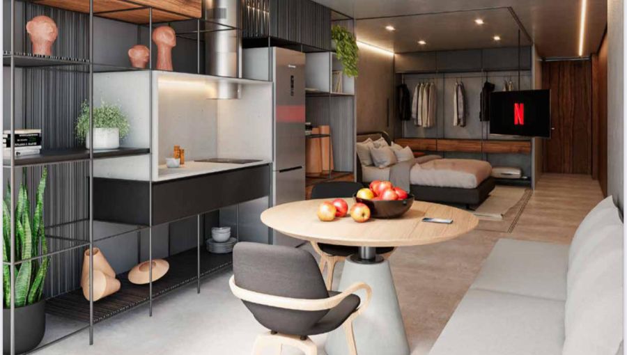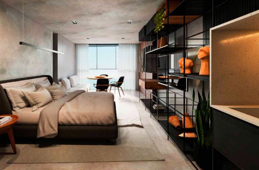 Apartamentos Studio de 22 a 52m² com quarto/sala de estar/jantar/cozinha/banheiro integrados, com e sem jardineira na sua sacada e 1 vaga de garagem;